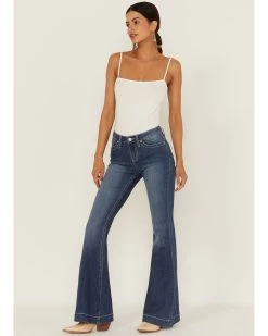 Shyanne Women’s Dark Wash Mid Embroidered Scoop Pocket Flare Jeans