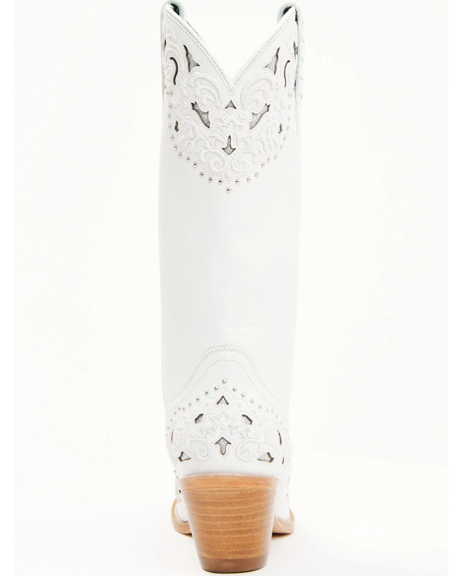 - Filigree embroidery with inlay and studded design on vamp and top of shaft