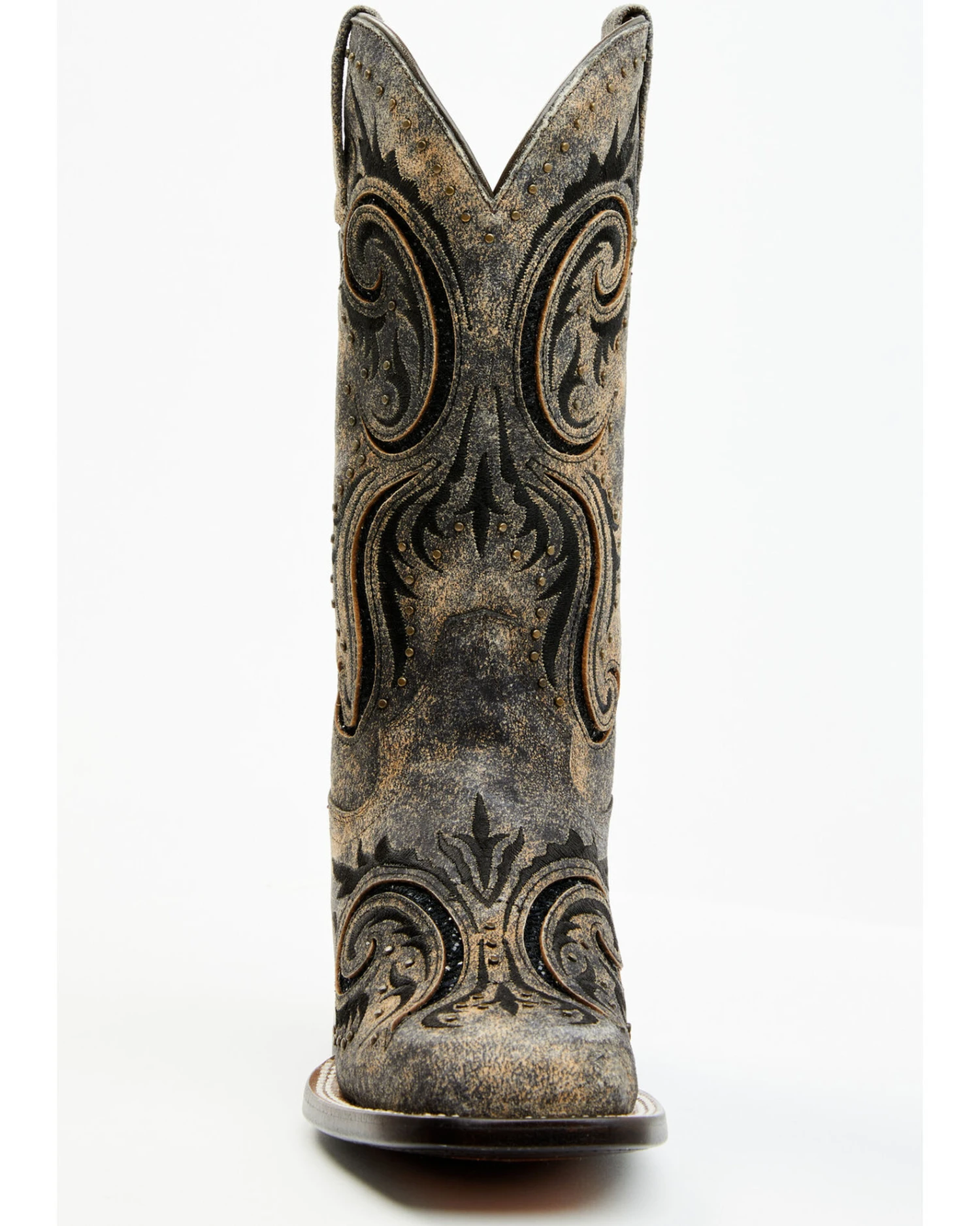 - Distressed brown with black filigree embroidered and inlay designs throughout