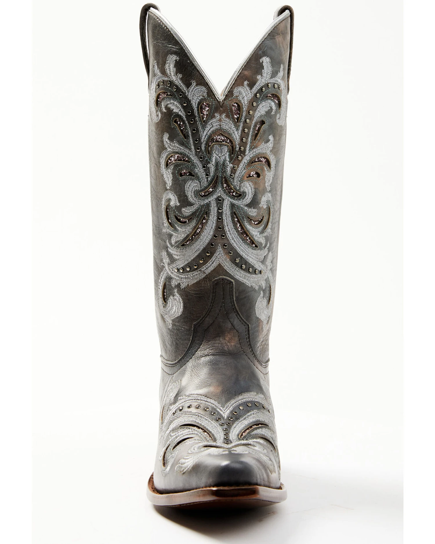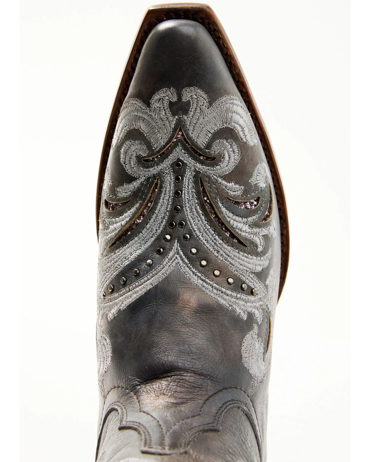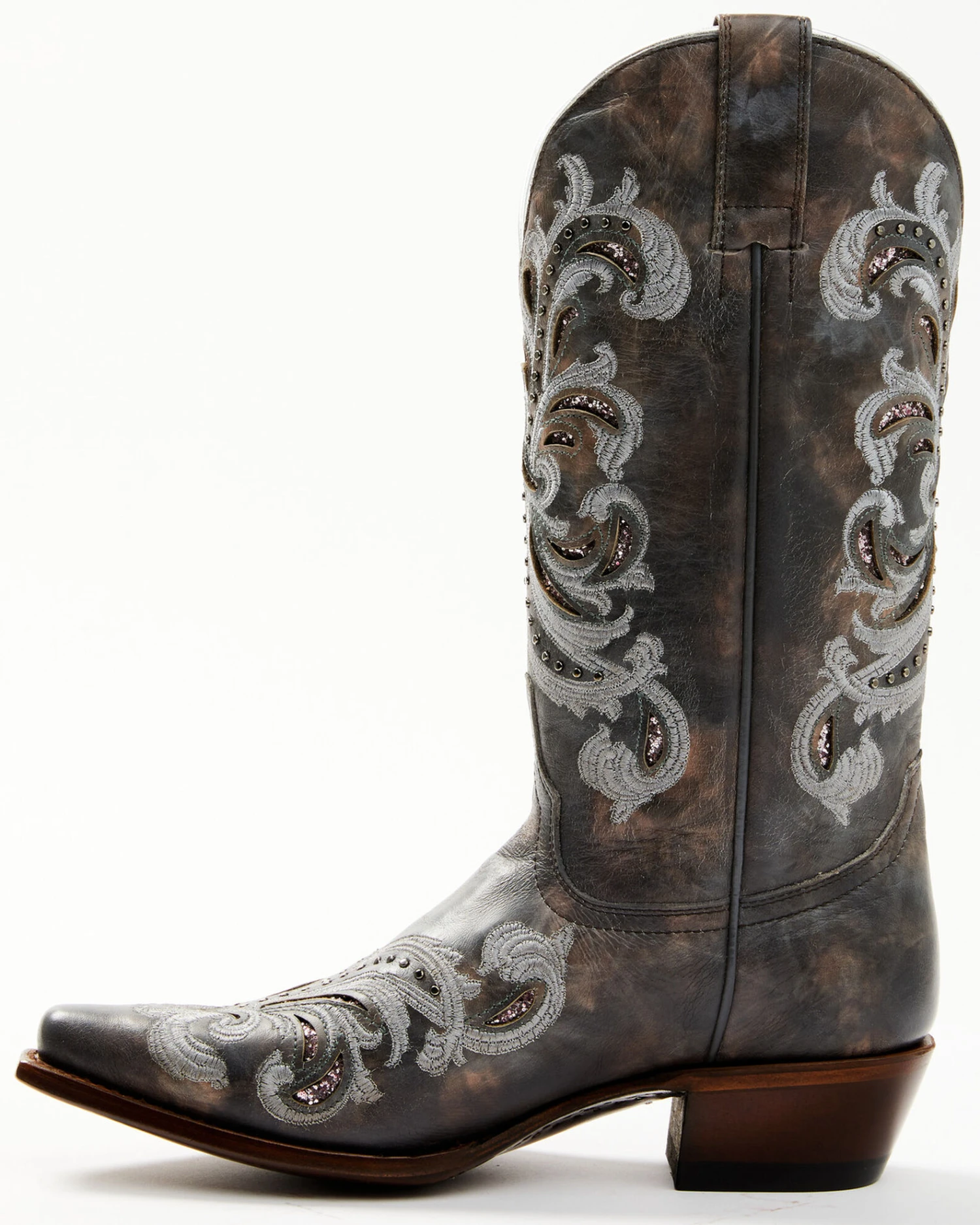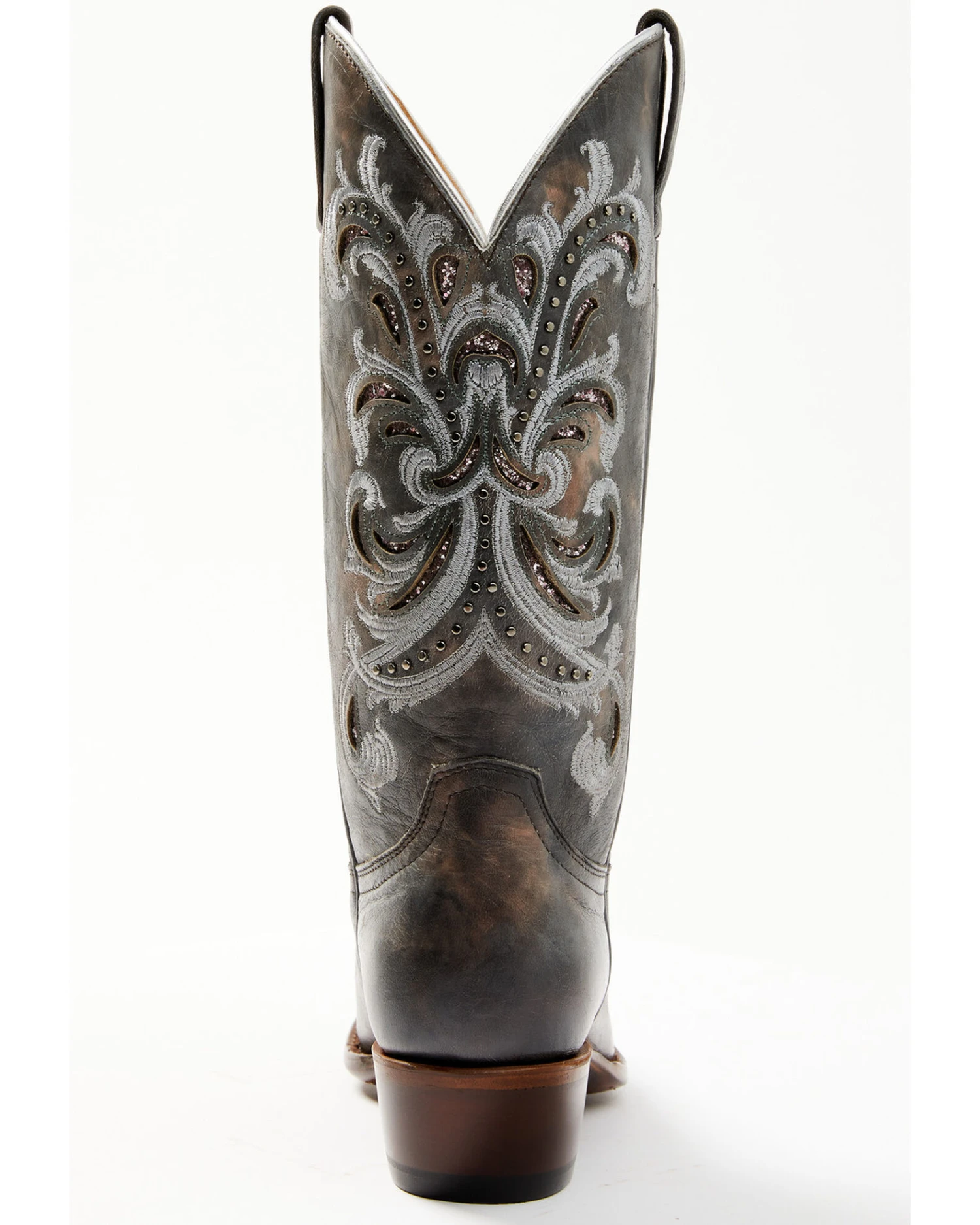 - Floral embroidery with embellished studs on shaft and vamp