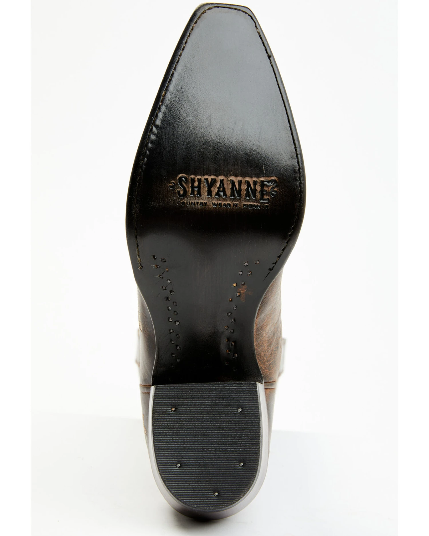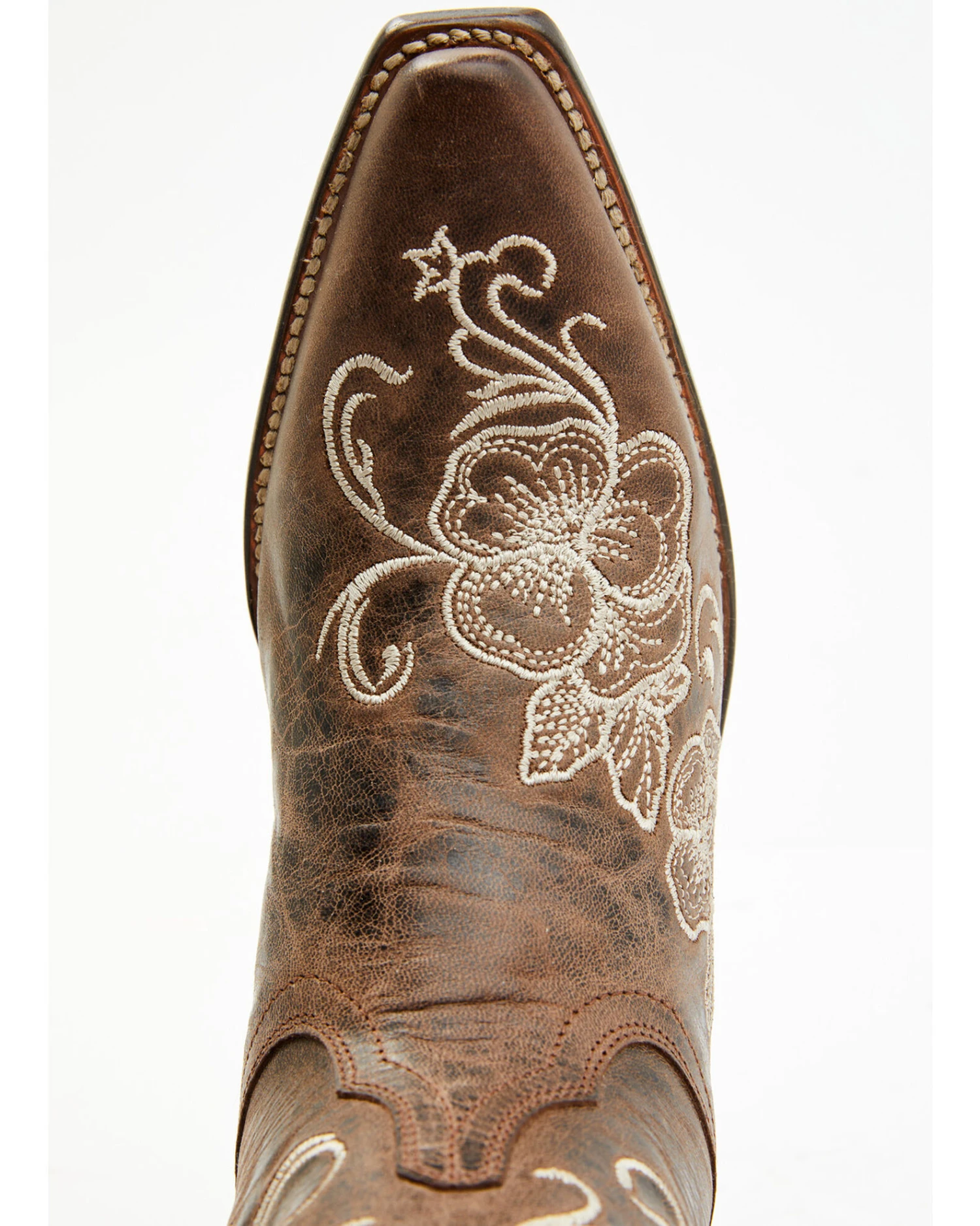 - Distressed brown with floral stitched embroidery pattern on shaft and vamp