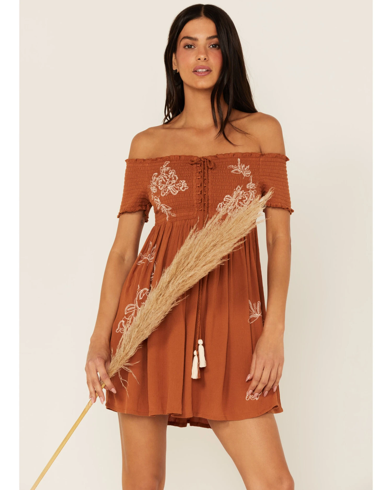 - Embroidered floral accents on rust fabric